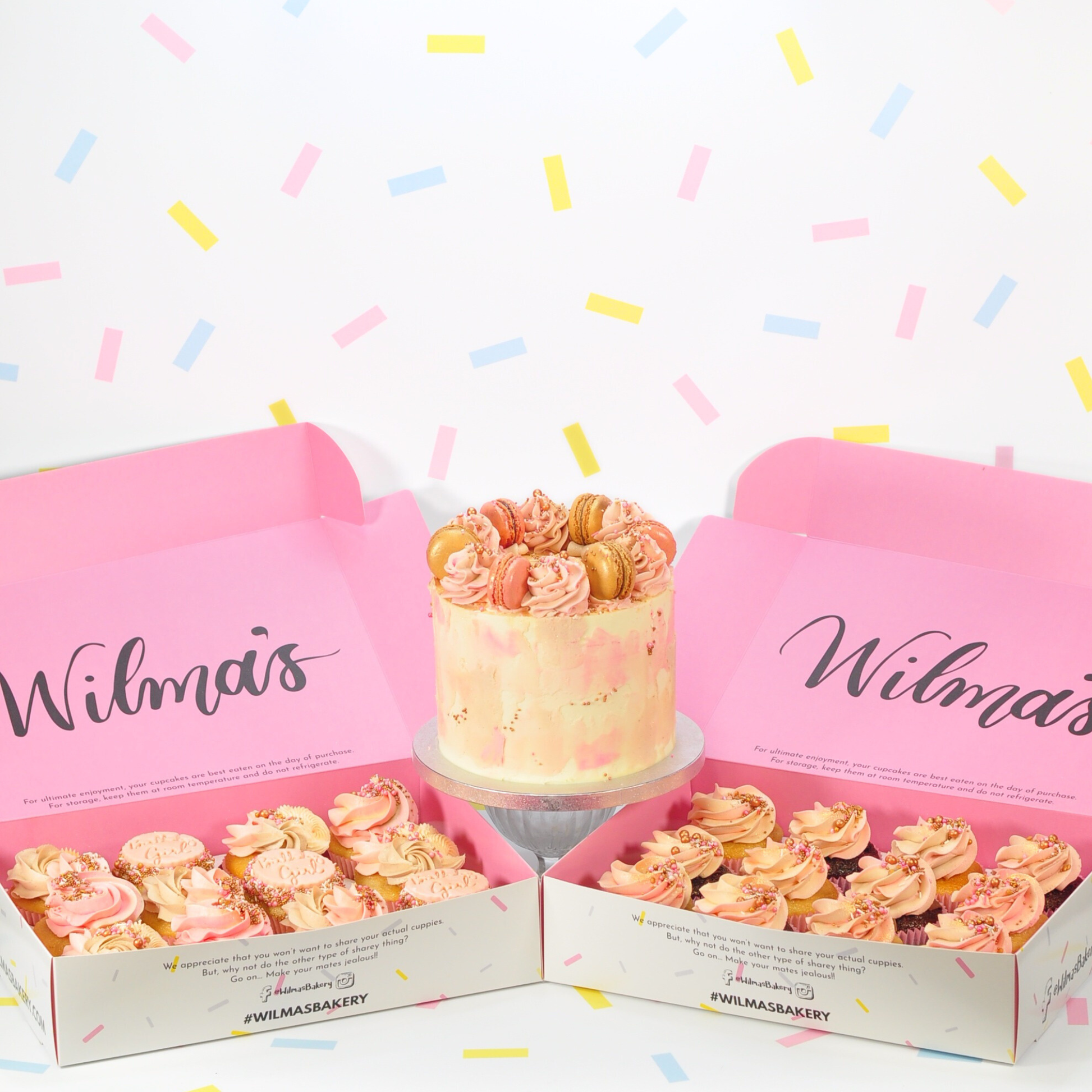 Your chosen flavour of cake wrapped in a textured buttercream outer in a pink, blush, beige, and cream palette. The cake is finished with a buttercream crown, matching sprinkles and spritz of edible glitter. Why not get some matching cupcakes too?