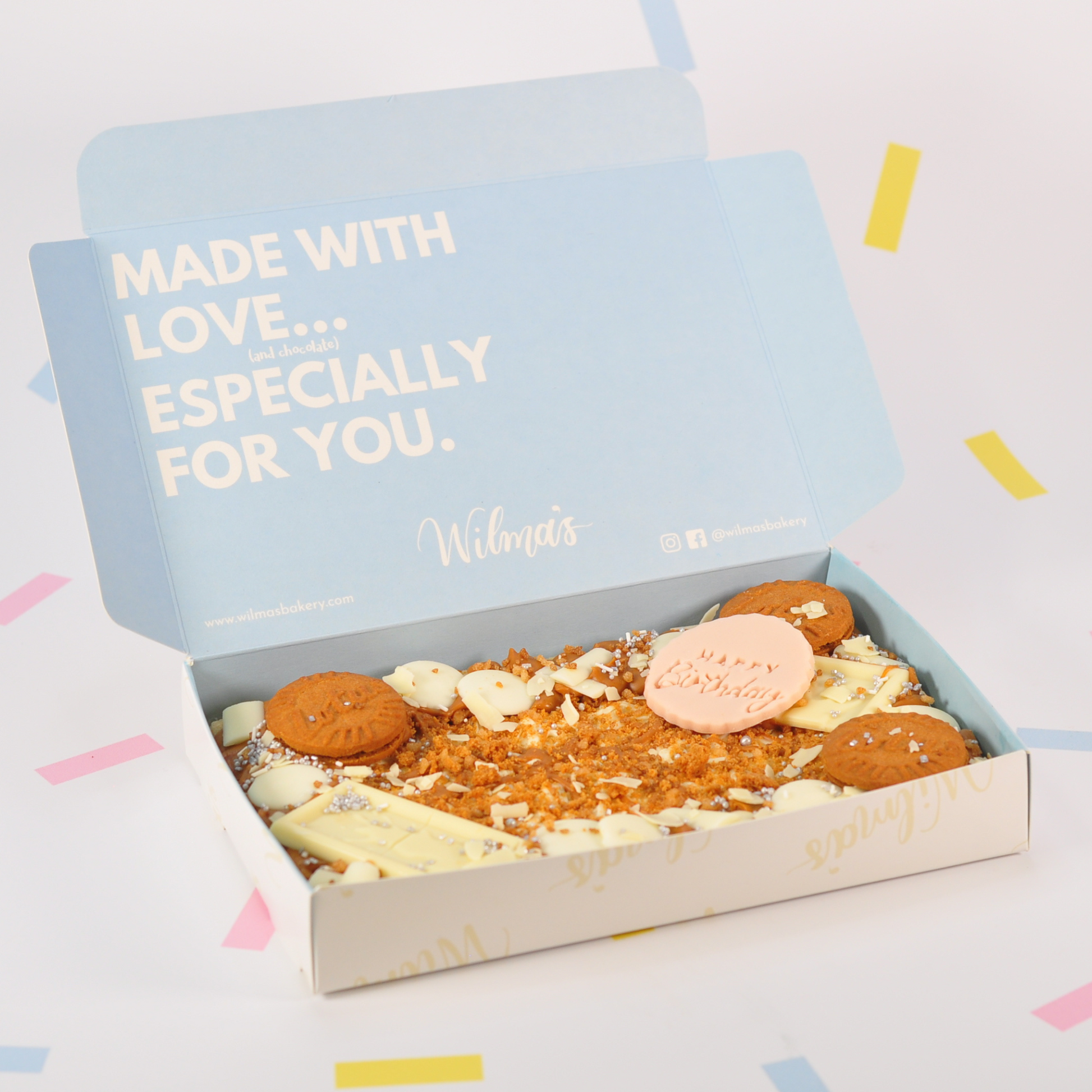Wilma's classic blondie swirled with the famous Speculoos spread, but in slab form. Filled with those biscuits, white chocolate chunks. Topped with a biscoff border, a selection of white chocolates & lotus biscuits, finished with white chocolate shavings & biscoff crunch.