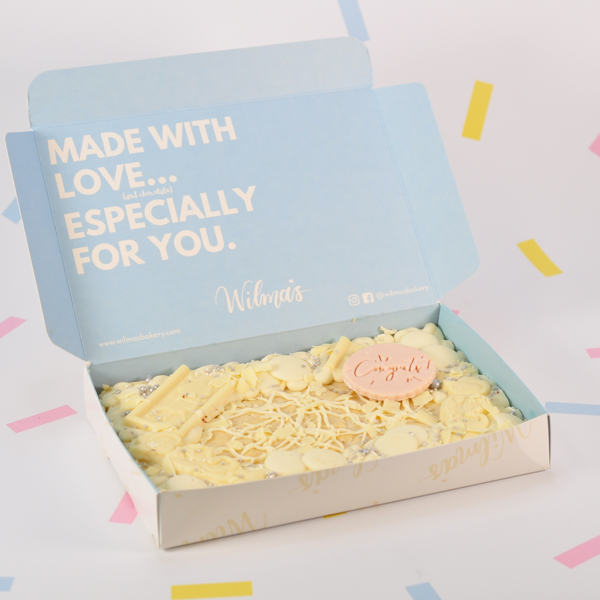 Wilma's classic blondie, but in slab form. Like a brownie but made with white chocolate. Filled with white chocolate buttons, topped with a white chocolate border and a selection of white chocolates, and finished with white chocolate shavings.